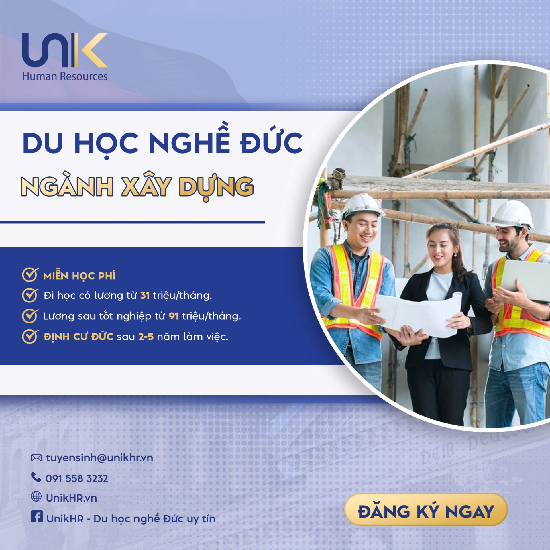 Nếu bạn đang tìm kiếm một đơn vị đồng hành đáng tin cậy, hãy để UnikHR giúp bạn hiện thực hóa giấc mơ. Liên hệ ngay với UnikHR để nhận tư vấn miễn phí và bắt đầu hành trình chinh phục ngành xây dựng tại Đức hôm nay!